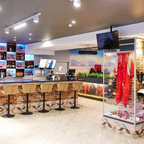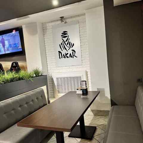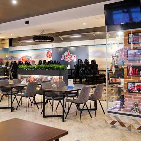 Здесь все стилизованно под «Дакар»: стулья в виде гоночных кресел, тематические граффити на стенах, многочисленная атрибутика (кубки, медали, образцы спортивной одежды с минувших спортивных состязаний). На входе — оригинальное колесо грузовика, принимавшего участие в ралли-рейде.