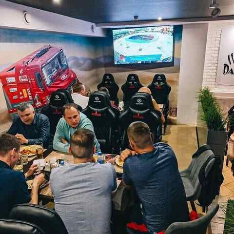 Здесь все стилизованно под «Дакар»: стулья в виде гоночных кресел, тематические граффити на стенах, многочисленная атрибутика (кубки, медали, образцы спортивной одежды с минувших спортивных состязаний). На входе — оригинальное колесо грузовика, принимавшего участие в ралли-рейде.