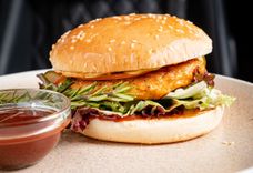 350/40 г • котлета куриная, томаты, маринованный огурец, соус BBQ, соус бургер, кетчуп